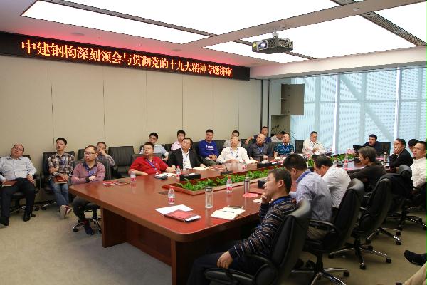 为深入贯彻党中央、国资委党委和中建总公司党组关于开展学习十九大精神活动的部署和要求,中建钢构特邀请深圳市委党校教授徐晓迪在公司总部大厦开展题为《学习贯彻和深刻领会党的十九大精神》的专题讲座。讲座由中建钢构党委委员、副总经理、总法律顾问周发榜主持,中建钢构党委书记、董事长王宏,党委副书记、纪委书记李骏骅等领导班子及总部机关全体党员在总部大厦参加了学习,公司下属单位共开设10个视频分会场,共计600余名党员参与。同时,本次讲座同步开通了网络直播,公司员工也可通过手机观看讲座直播。 徐晓迪教授紧紧围绕“党的十九大报告”这一主题,分别从学习的逻辑框架、从谋篇布局看总书记治国理政战略思维、从字里行间看总书记治国理政战术部署、强国崛起的时代四个方面全面系统阐释了党的十九大精神,深入浅出地为大家解读了“为什么要学习党课、怎么学习党课、学习党课的重要意义在哪里”,并结合中建钢构央企身份,着重为大家解读了十九大报告中涉及国企改革、政府效能、经济发展、党的建设、未来趋势等方面的内容,理论深刻而具有体系,案例丰富而具有启发。中建钢构广大党员同志纷纷表示讲座内容充实而深受启发,在今后的工作中继续深入学习十九大精神,在实践中认知,在领悟中进步。