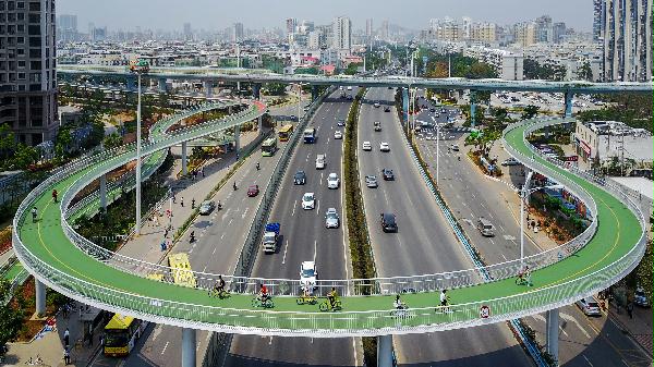 厦门市空中自行车快速道示范段是全国首条、世界最长的空中自行车道。项目以桥梁高架形式设计,依托快速公交 BRT桥下空间建造,从头到尾 7.6公里没有一个交叉路口,没有一盏红绿灯,一路畅行无阻,保障了自行车骑行的专用路权。设计时速达到 25-30千米每小时,是一般自行车道的两倍以上。通过营造安全、顺畅、舒适、美观的和谐骑行环境,满足了市民日益增长的安全、绿色出行的需要,让绿色骑行成为一种潮流,为解决城市中心城区交通拥堵问题提供了“钢构方案”和“钢构智慧”。