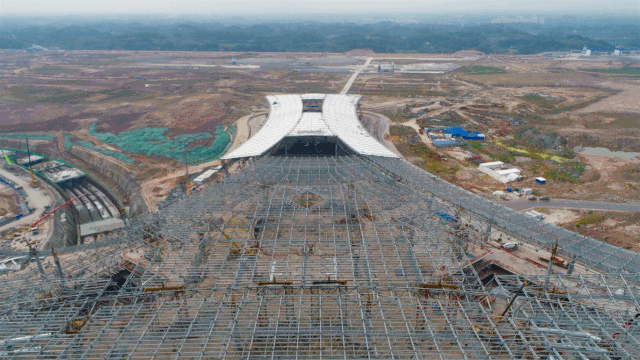 由中建科工承建钢结构制造、安装工程的成都天府国际机场T1航站楼,总用钢量2.8万吨,网架杆件数量达16万根,网架投影面积达18万平方米,相当于25个标准足球场大小。