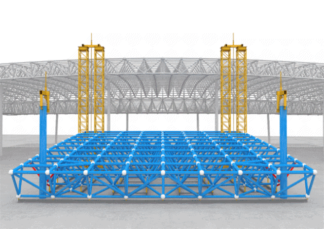 预应力钢拉杆张拉与大跨度网架整体提升技术组合应用 成都天府国际机场T1航站楼A、C指廊采用局部张弦的网架结构,指廊中间天窗带设置下弦钢拉杆替代下弦杆,因此在常规网架安装施工的技术上融入了预应力张拉技术。故在网架整体提升施工过程中需考虑预应力张拉施工工序的插入时点,以及两种施工技术在网架安装施工过程中对网架受力及变形的相互影响。项目技术团队运用有限元结构计算软件进行网架整体提升施工模拟验算和钢拉杆张拉模拟验算,通过在不同工况下多频次多点位进行网架变形监测,并通过液压同步控制系统进行网架姿态调整,以此保证网架结构安装精度满足设计要求。